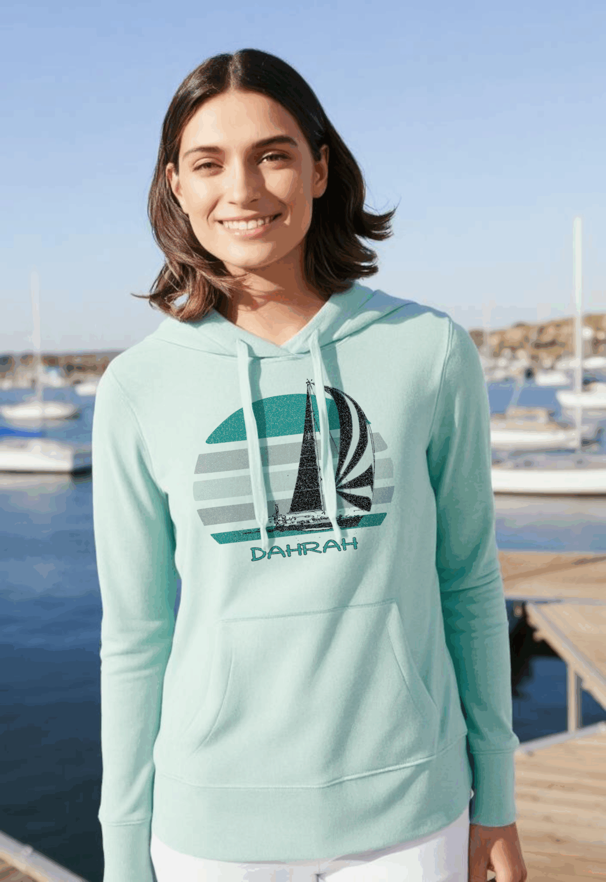 Sailing hoodie with sailboat at sunset by DAHRAH, unisex, normal fit, for mid-season. 85% organic cotton, 15% recycled polyester, 280 GSM (gram per square meter). Vegan and OEKO-TEK certified.  Click here for size advise: take a hoodie that you own which fits you well and compare the dimensions.