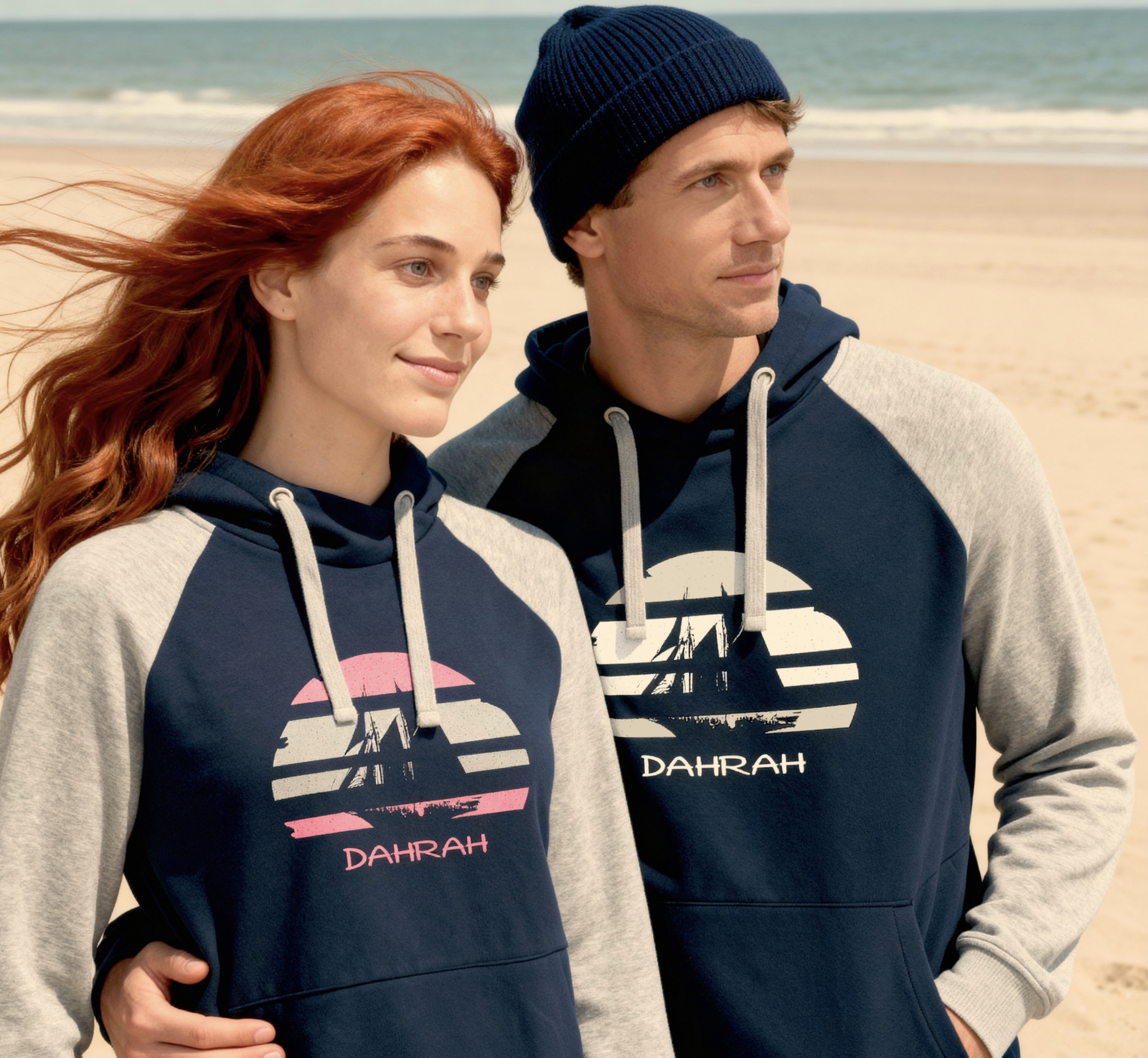 Sailing hoodie by DAHRAH, with print of Flying Dutchman sailboat at sunset. Normal fit, bi-color and raglan sleeves. For winter or mid-season. Composition: 55% cotton / 40% polyester / 5% viscose. 280 GSM (gram per square meter). Vegan and OEKO-TEK certified.  Click here for size advise: take a hoodie that you own which fits you well and compare the dimensions.