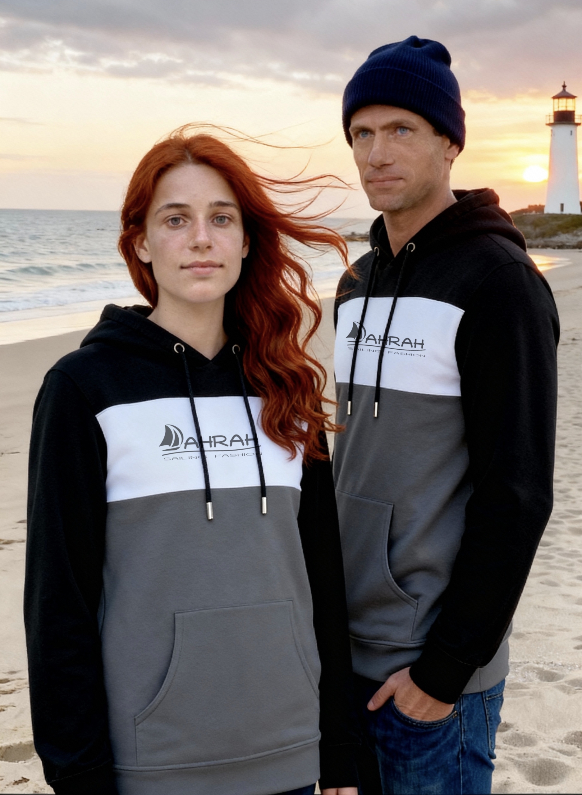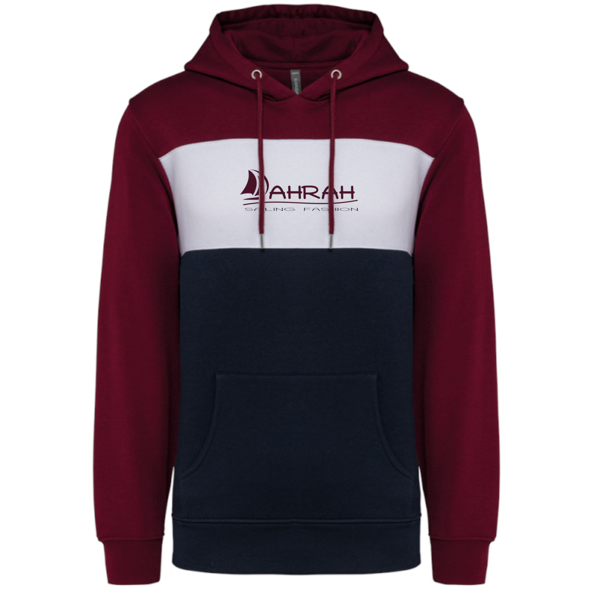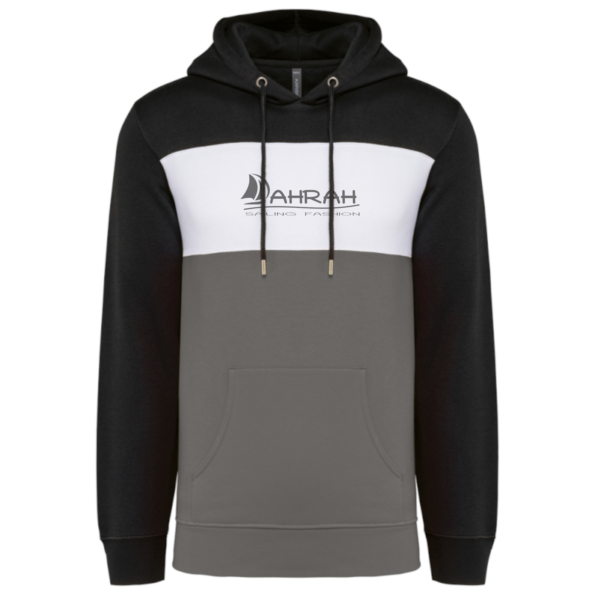 Sailing hoodie by DAHRAH, with print of Dahrah sailboat logo. Tricolor unisex hoodie, normal fit for mid-season.