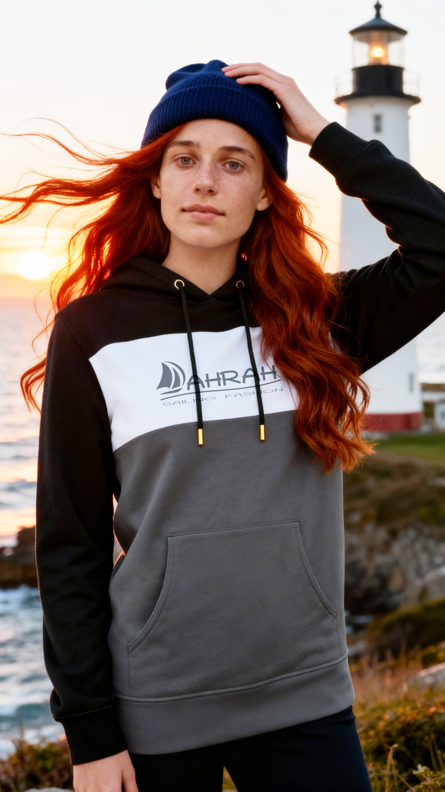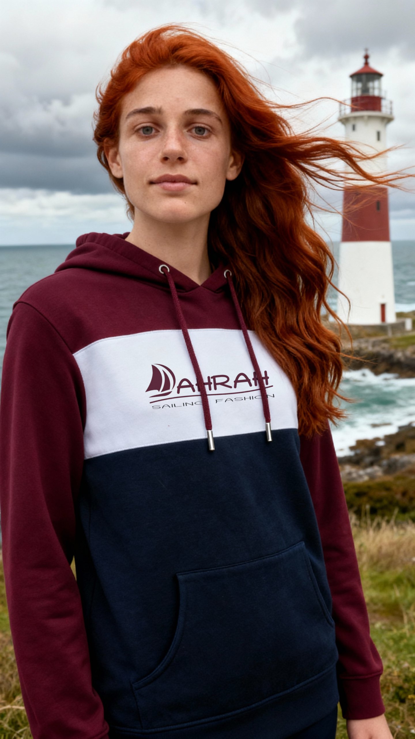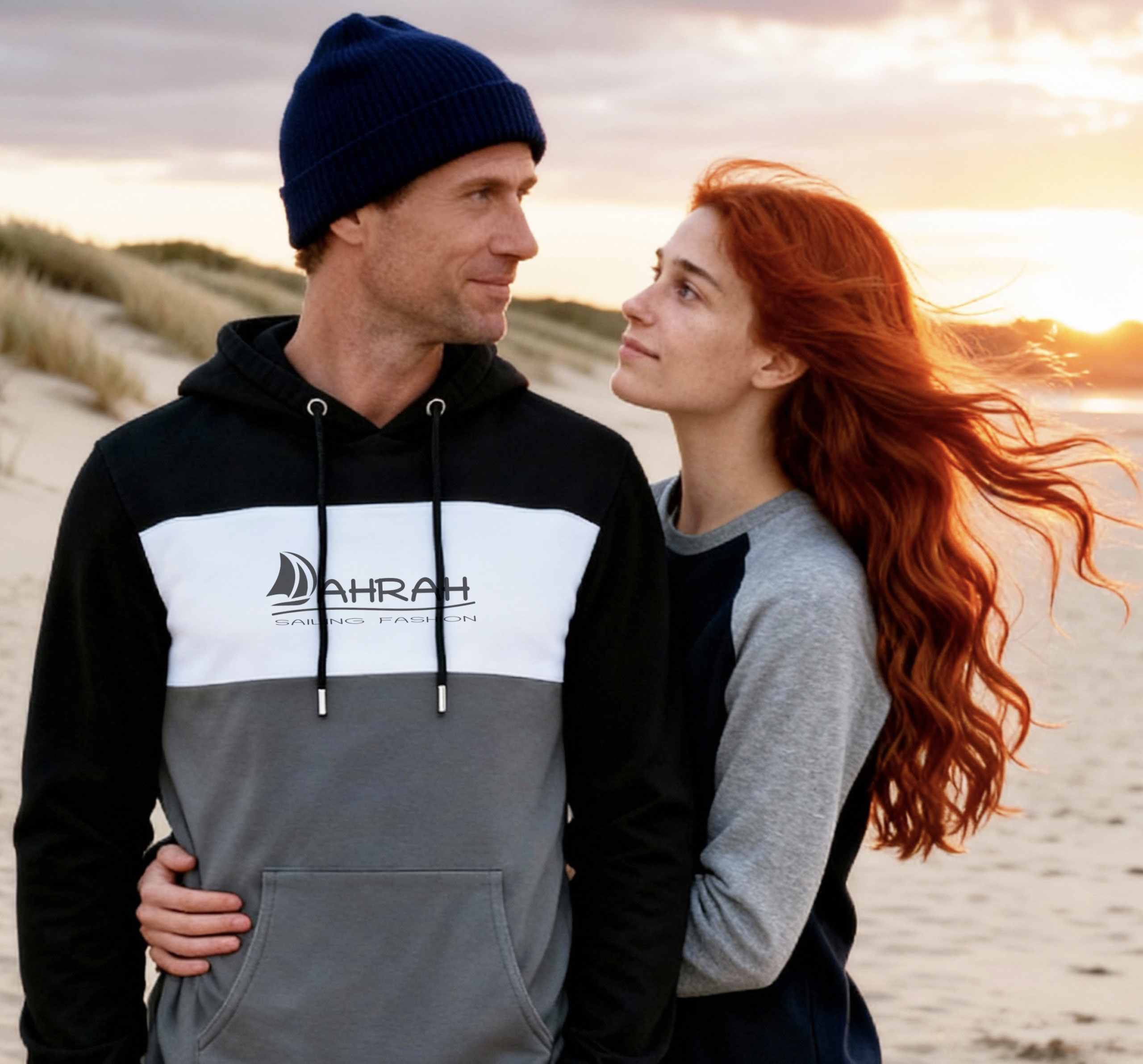 Sailing hoodie by DAHRAH, with print of Dahrah sailboat logo. Tricolor unisex hoodie, normal fit for mid-season.
