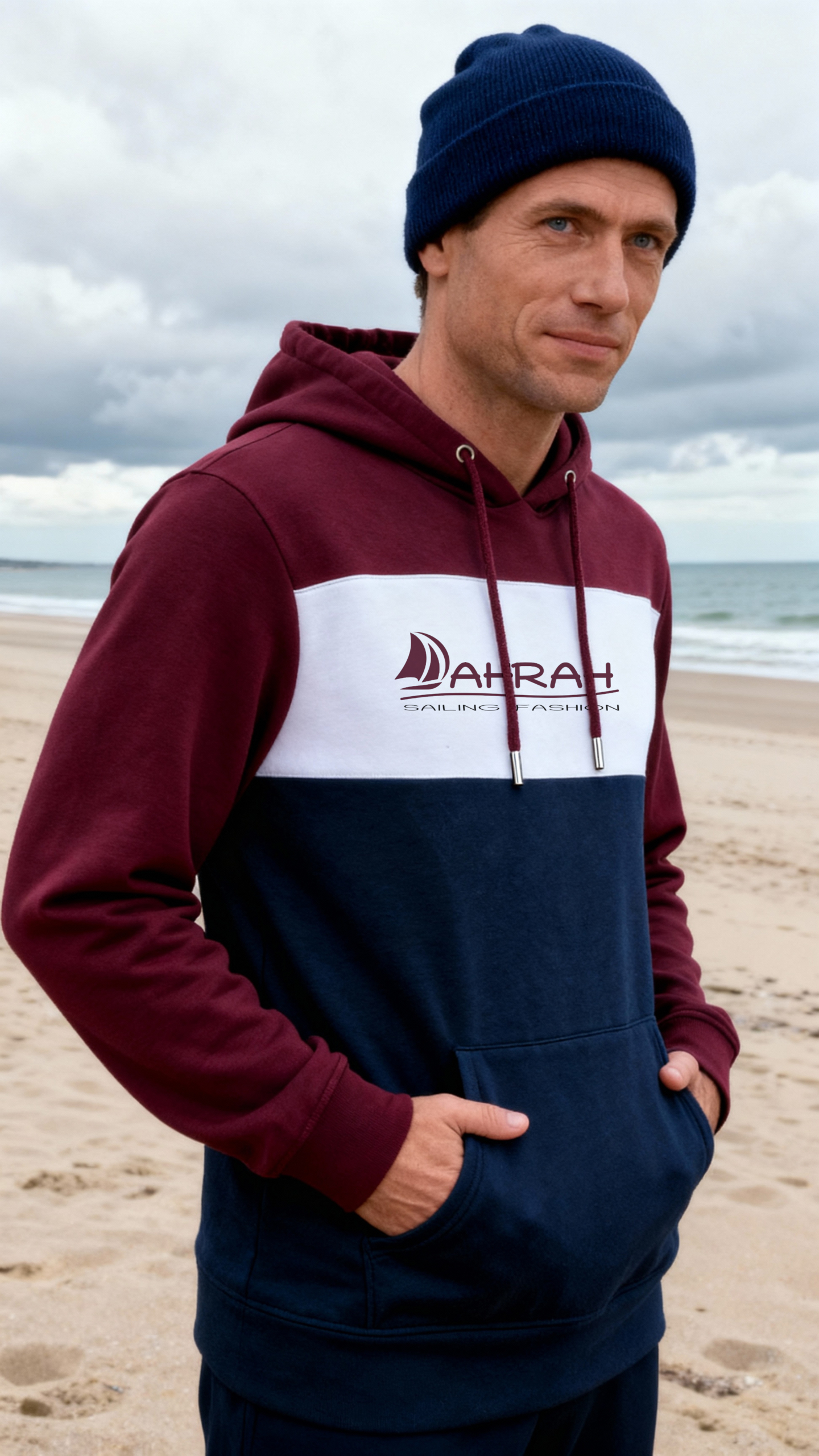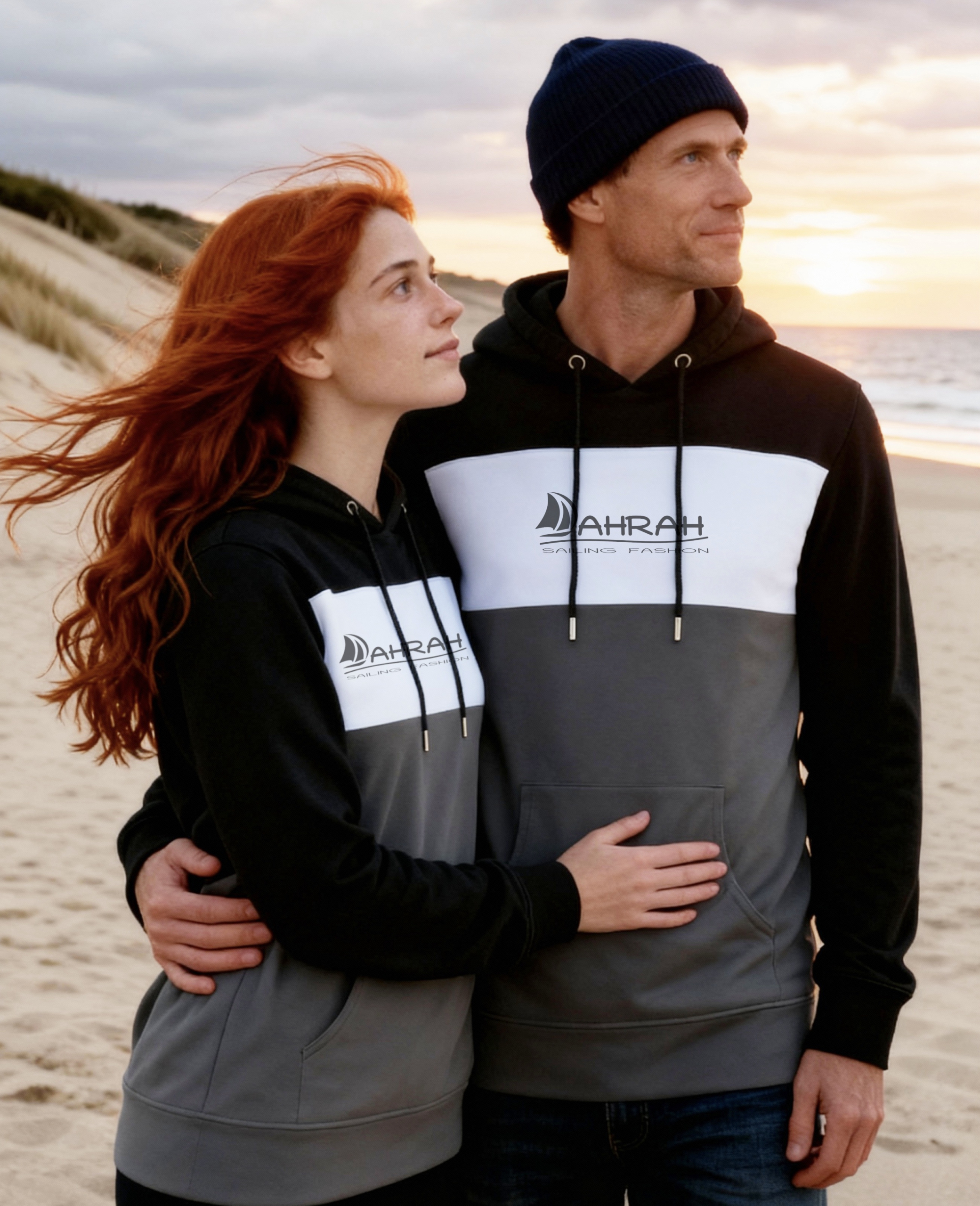 Sailing hoodie by DAHRAH, with print of Dahrah sailboat logo. Unisex, normal fit and tri-color. For mid-season. 80% organic cotton, 20% recycled polyester, 350 GSM (gram per square meter). Vegan and OEKO-TEK certified. Click here for size advise: take a hoodie that you own which fits you well and compare the dimensions.
