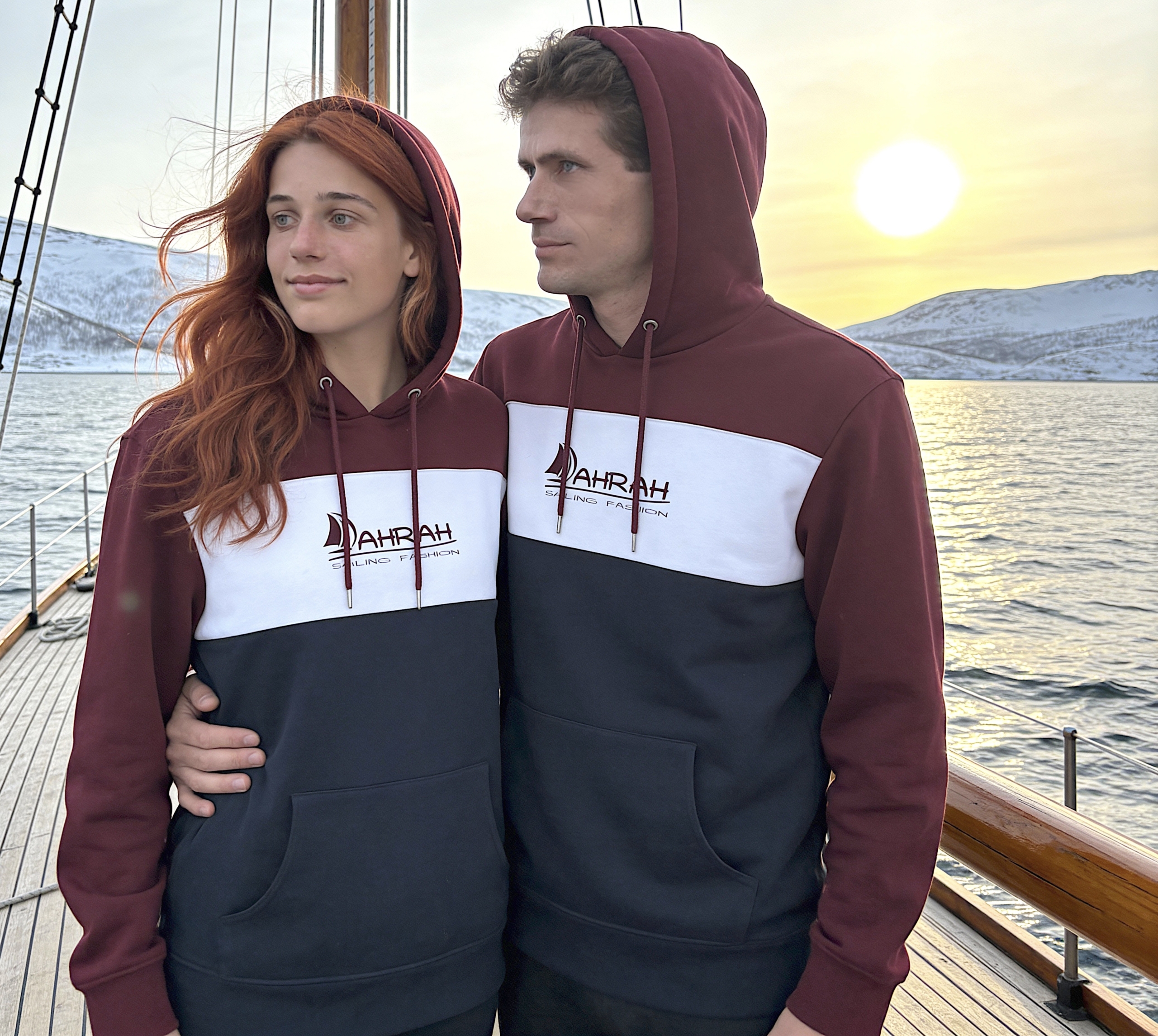 Marine sailing hoodie by DAHRAH, with print of Dahrah sailboat logo. Tricolor unisex hoodie, normal fit for mid-season.