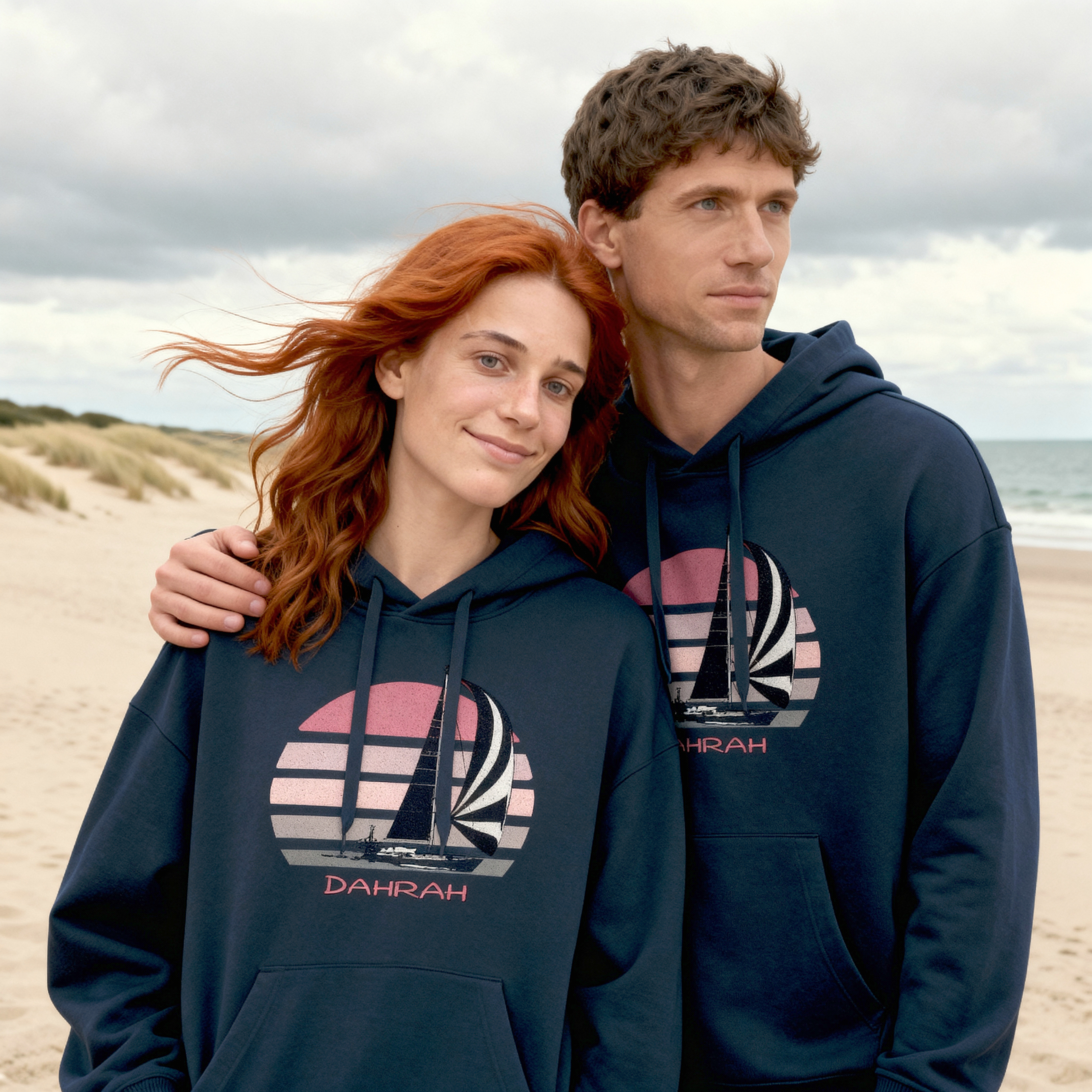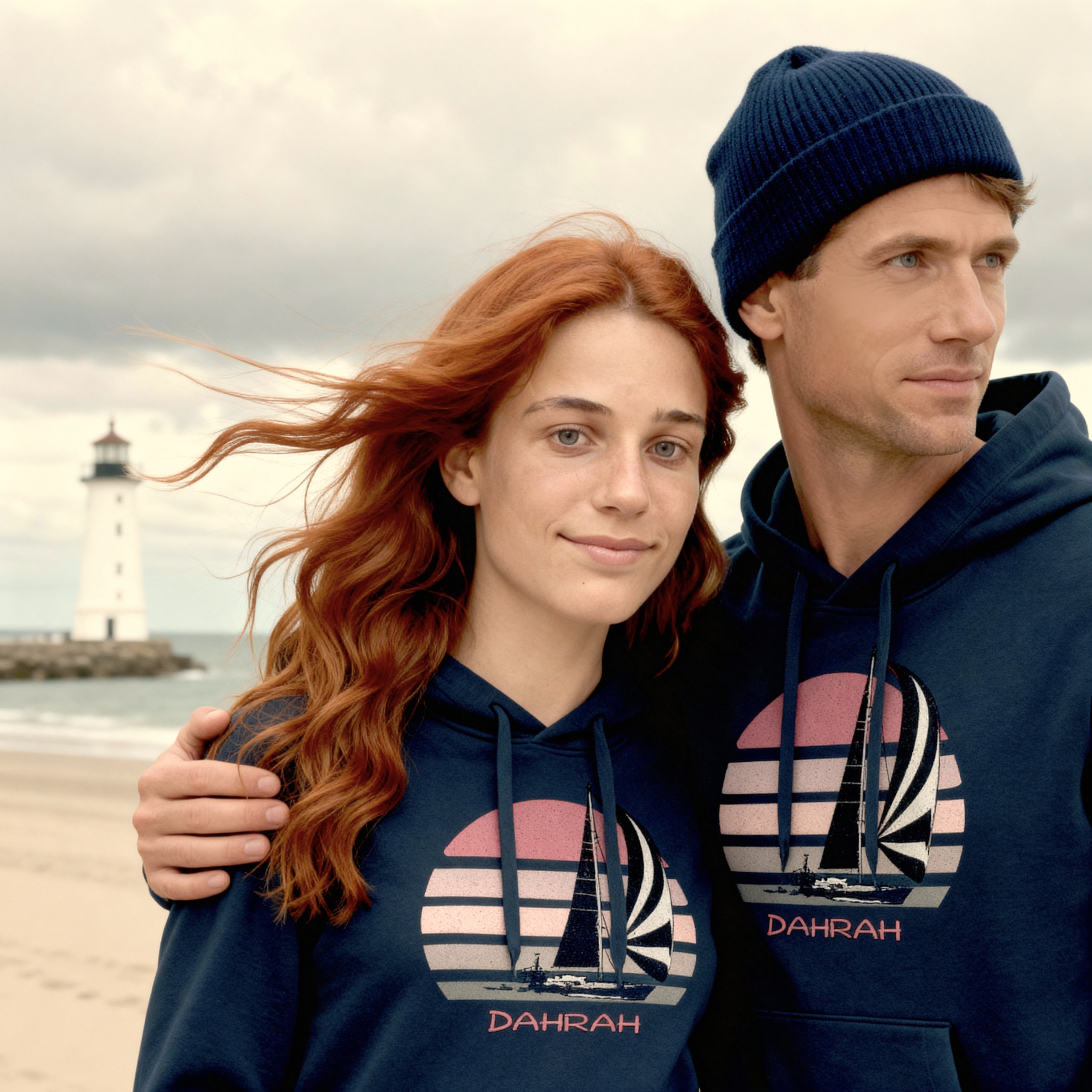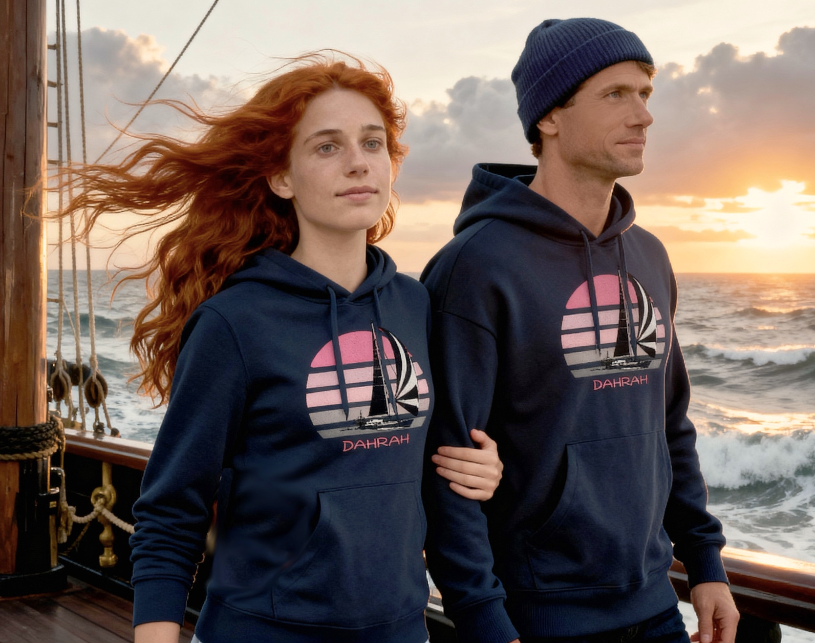Sailing hoodie with sailboat at sunset by DAHRAH, unisex, normal fit, for mid-season. 85% organic cotton, 15% recycled polyester, 280 GSM (gram per square meter). Vegan and OEKO-TEK certified.  Click here for size advise: take a hoodie that you own which fits you well and compare the dimensions.