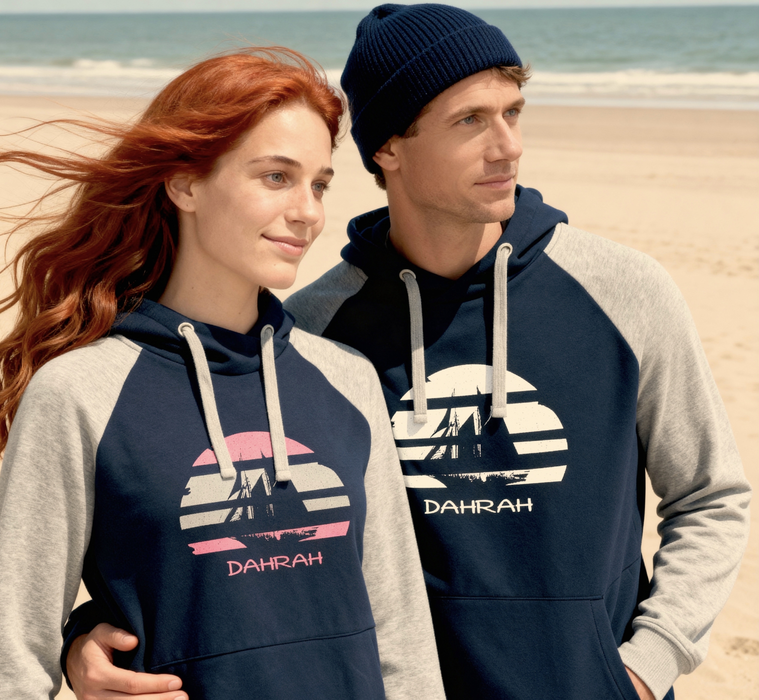 Sailing hoodie by DAHRAH, with print of Flying Dutchman sailboat at sunset. Normal fit, bi-color and raglan sleeves. For winter or mid-season. Composition: 55% cotton / 40% polyester / 5% viscose. 280 GSM (gram per square meter). Vegan and OEKO-TEK certified. Click here for size advise: take a hoodie that you own which fits you well and compare the dimensions.