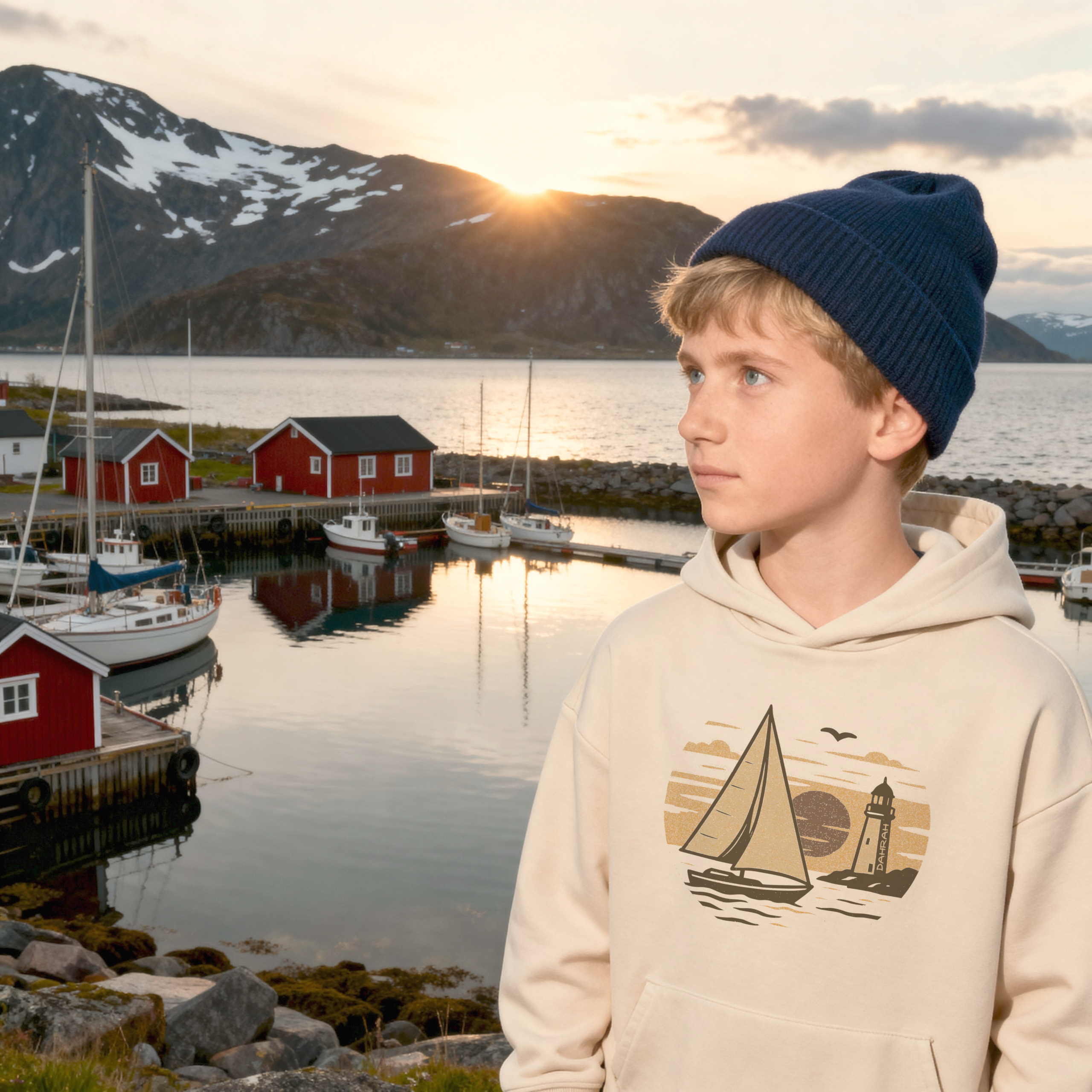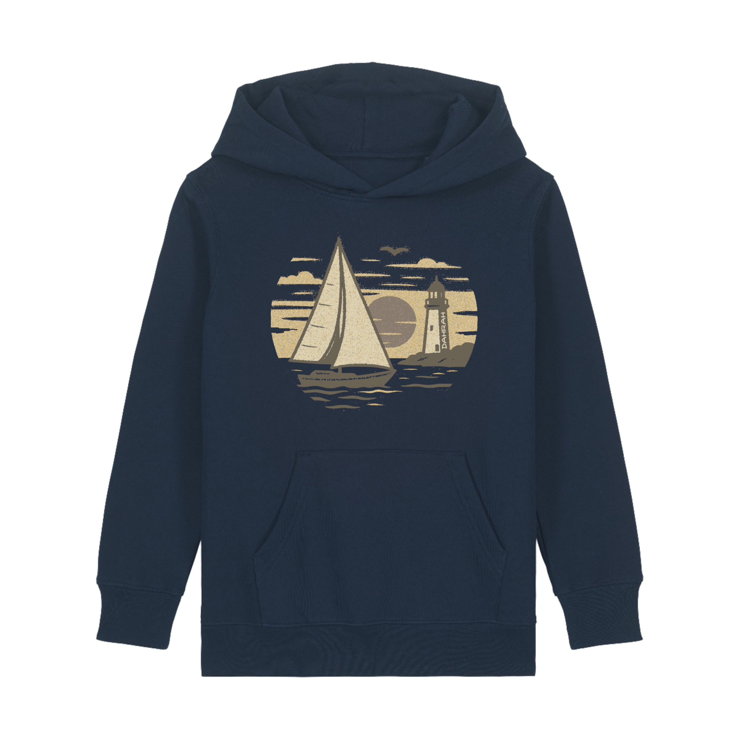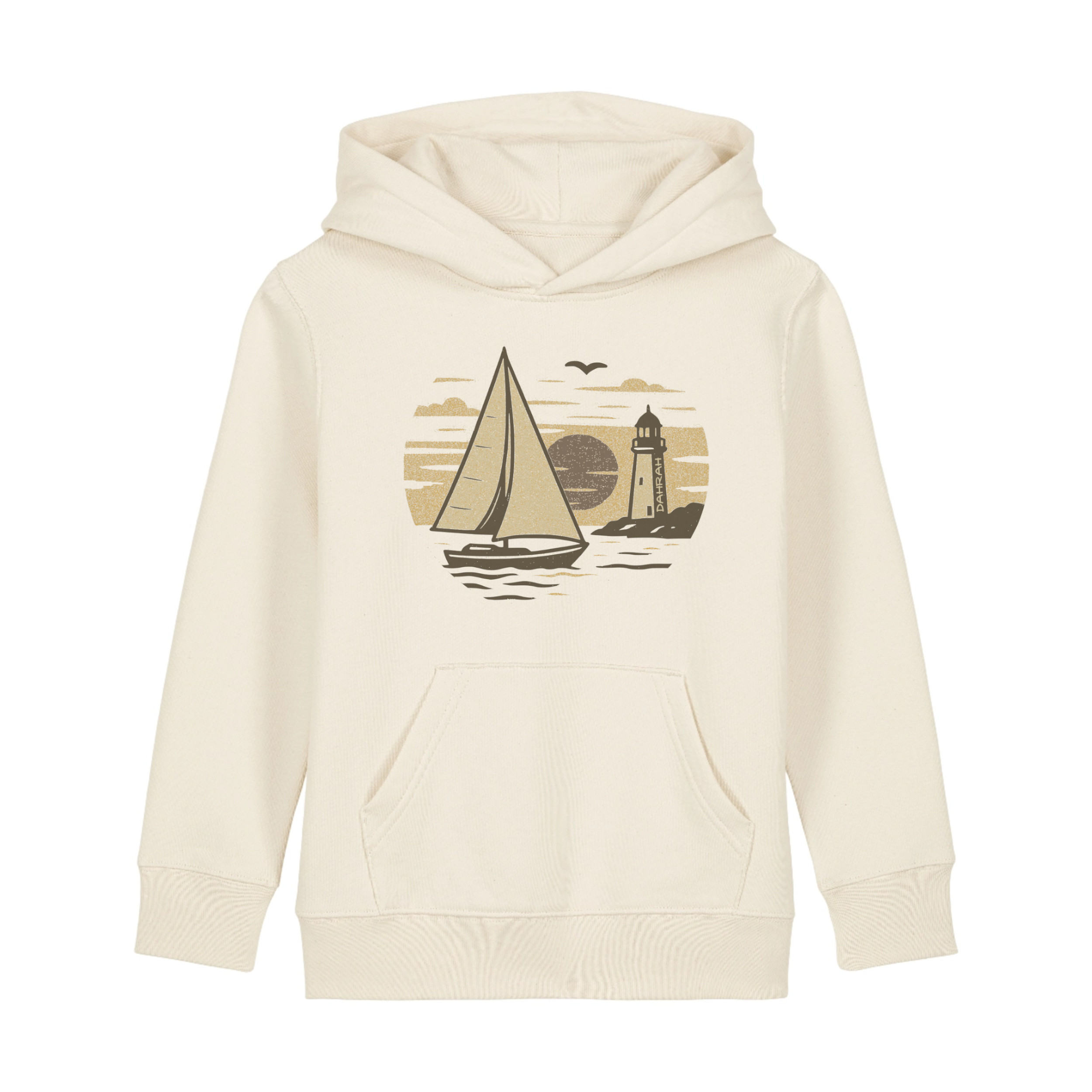 Sailing hoodie for children with vintage sailboat and lighthouse, by DAHRAH. Normal fit, for mid-season. 80% organic cotton, 20% recycled polyester, 350 GSM (gram per square meter). Vegan and OEKO-TEK certified.  Click here for size advise: take a hoodie that you own which fits you well and compare the dimensions.