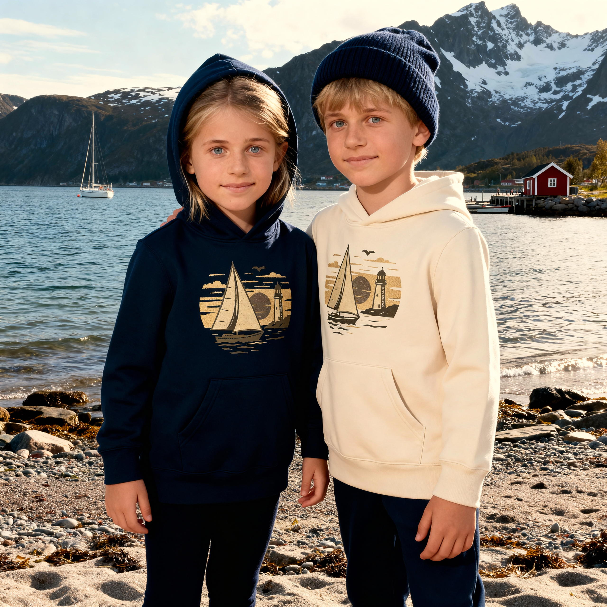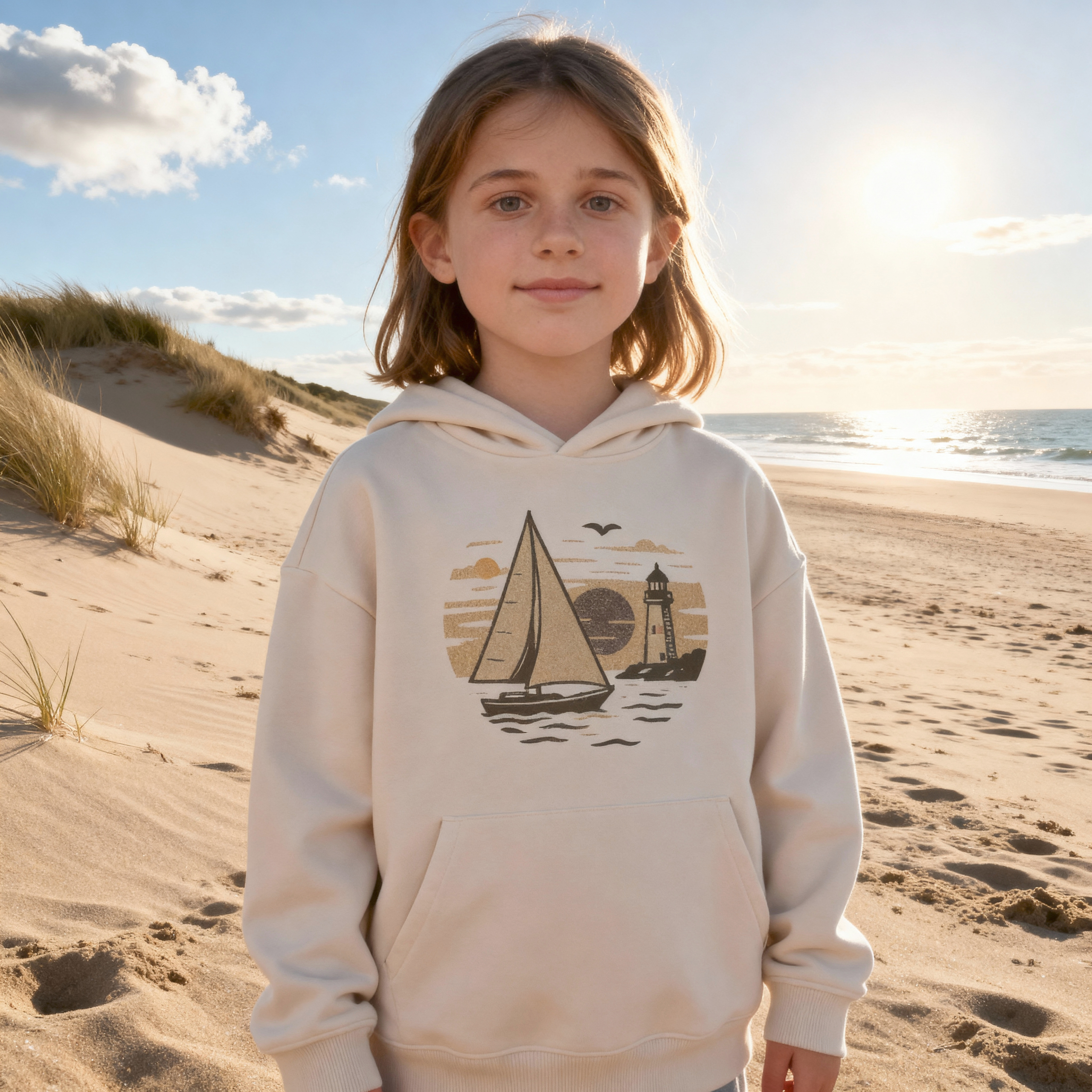 Sailing hoodie for children with print of a vintage sailboat and lighthouse. Normal fit for mid-season.