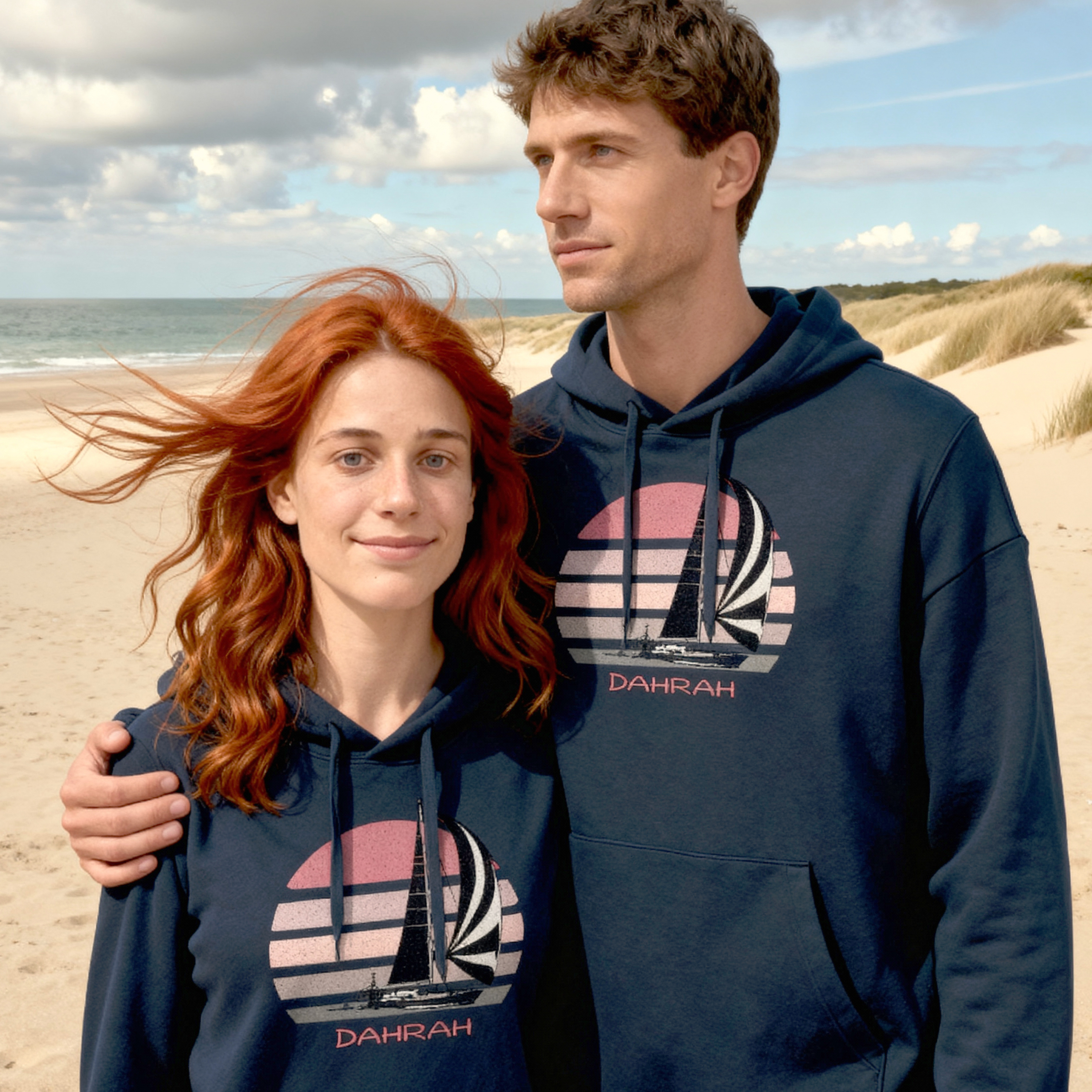 Sailing hoodie with sailboat at sunset by DAHRAH, unisex, normal fit, for mid-season. 85% organic cotton, 15% recycled polyester, 280 GSM (gram per square meter). Vegan and OEKO-TEK certified.  Click here for size advise: take a hoodie that you own which fits you well and compare the dimensions.